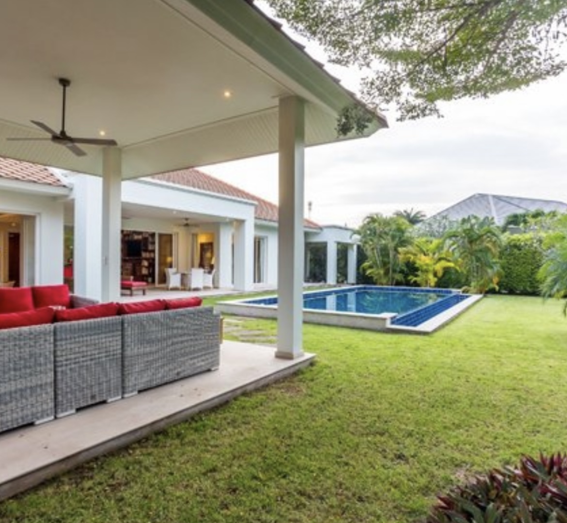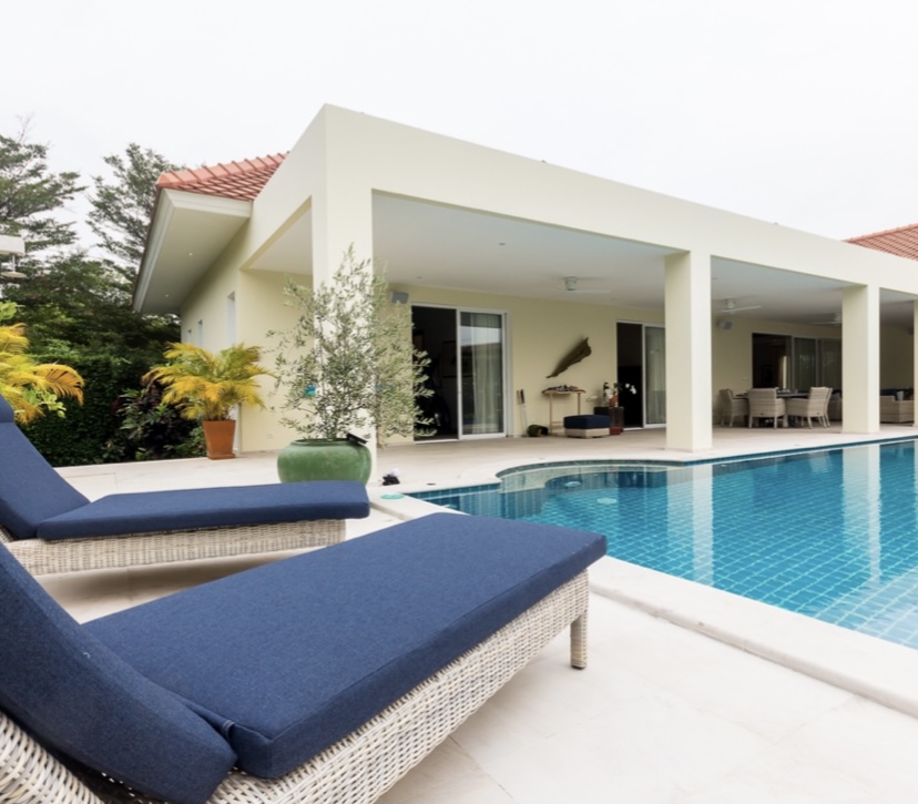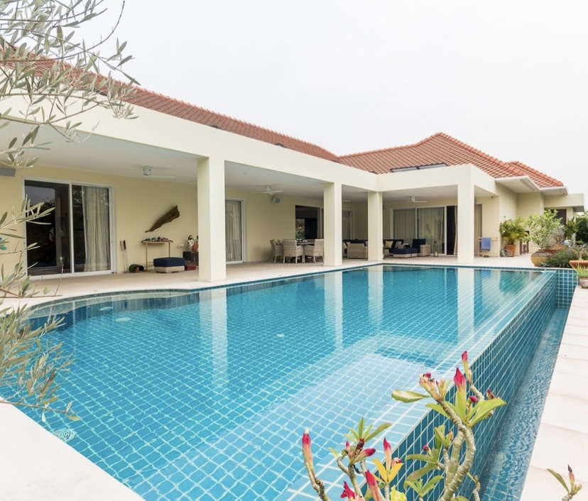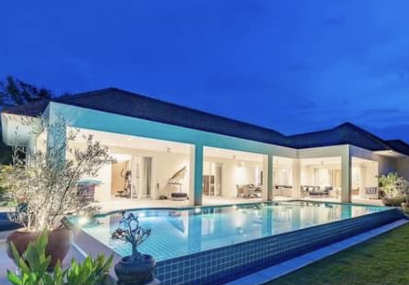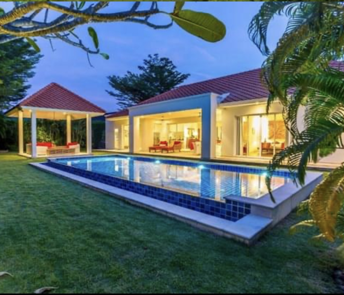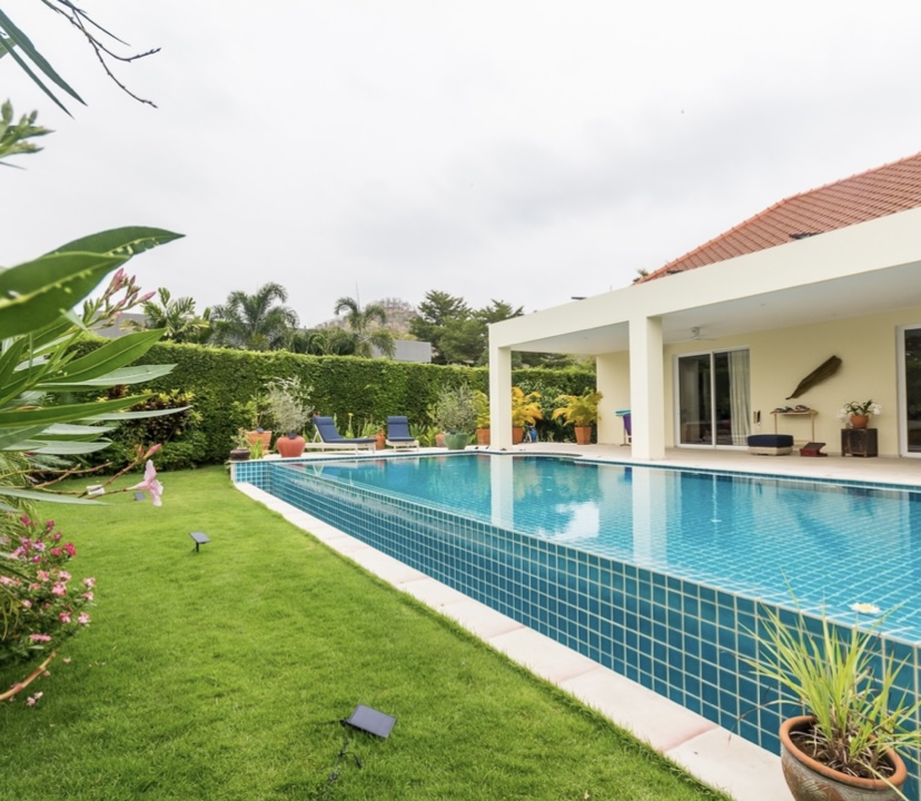 This magnificent pool villa in a prestigious development, a stone's throw from Black Mountain Golf Club,breathes quality, class.,elegance, and a sophisticated lifestyle. The 3 bedrooms,3 bathrooms,house has a living area of 368 sqm and stands on a 1,260 sqm plot. The property is surrounded by high hedges that provide total privacy and tranquility. The villa has full chanote in Thai name.