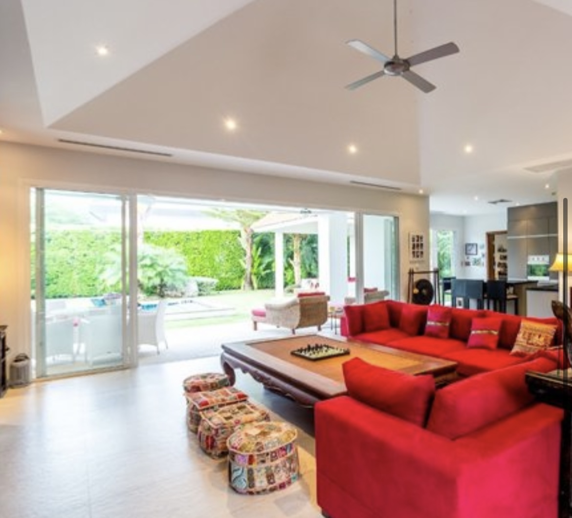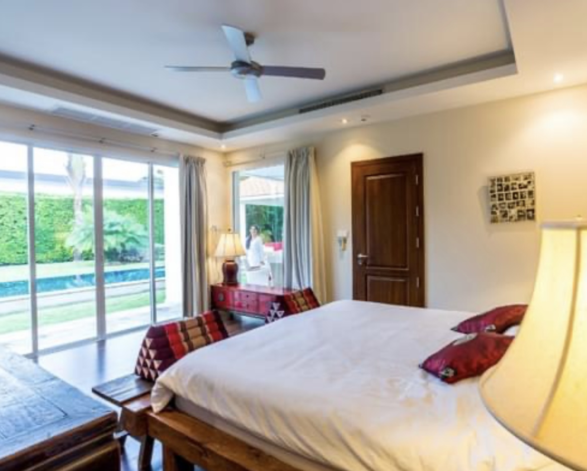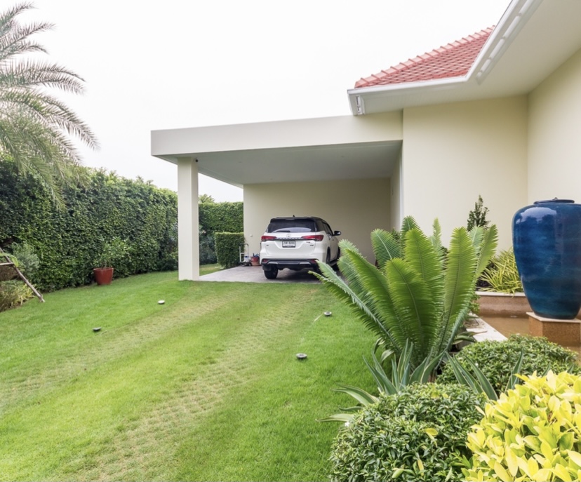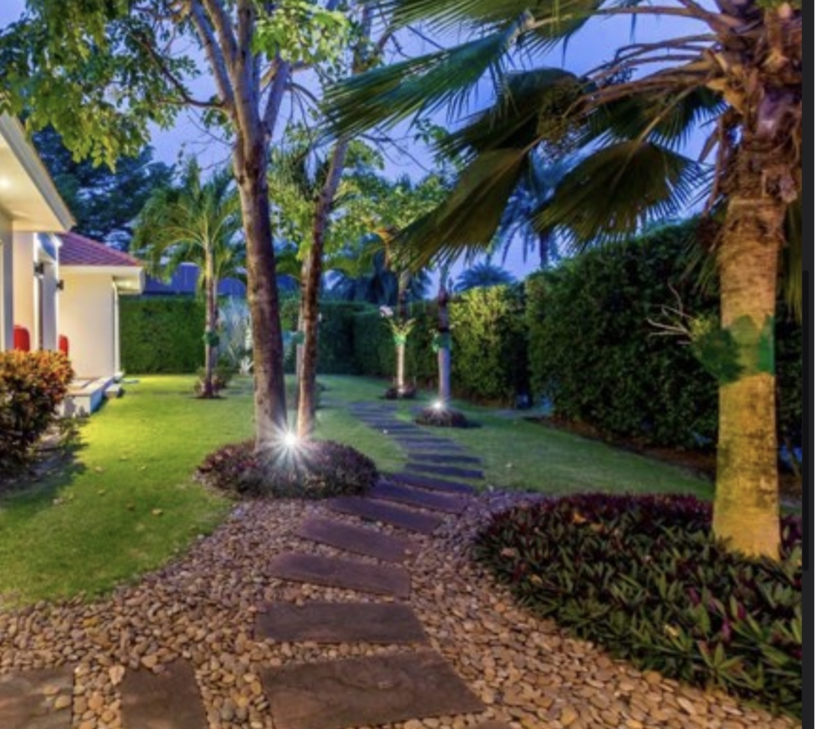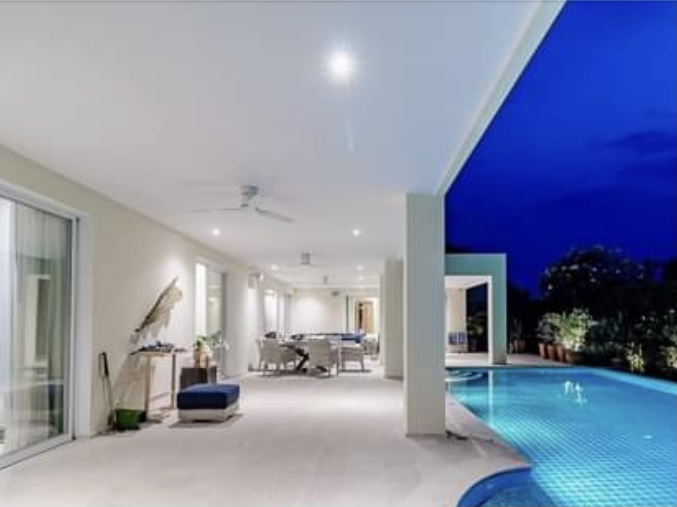 This magnificent pool villa in a prestigious development, a stone's throw from Black Mountain Golf Club,breathes quality, class.,elegance, and a sophisticated lifestyle. The 3 bedrooms,3 bathrooms,house has a living area of 368 sqm and stands on a 1,260 sqm plot. The property is surrounded by high hedges that provide total privacy and tranquility. The villa has full chanote in Thai name.