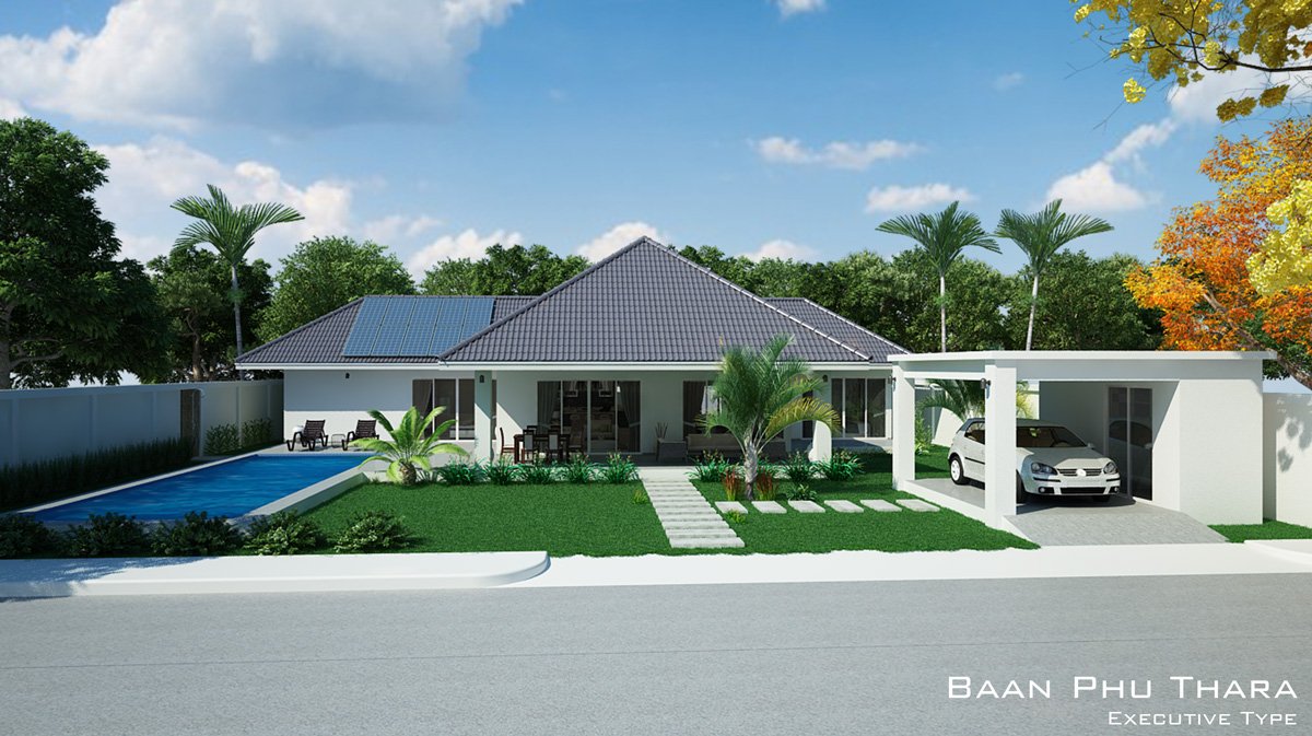 Executive Villa is a three bedroom design with all bedrooms having en-suite facilities, this villa has a living area of 203 Sqm. All bedrooms enjoy access to the terrace and 12m x 4m swimming pool. The main area of the house, which includes the Kitchen, Dining and Living room, is open plan and this villa also has a separate laundry room and office. From 12.286M THB