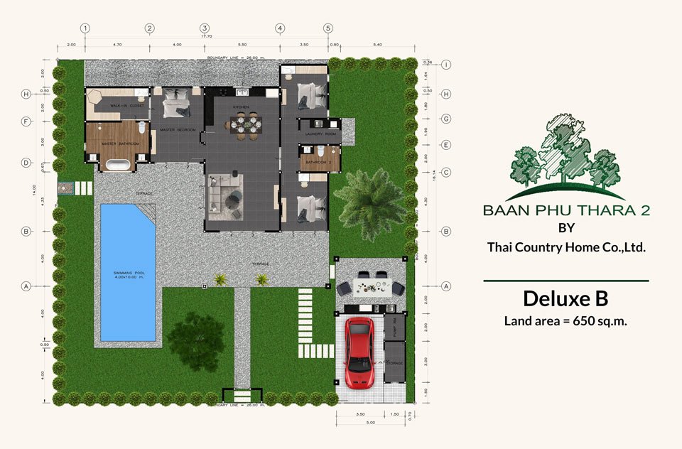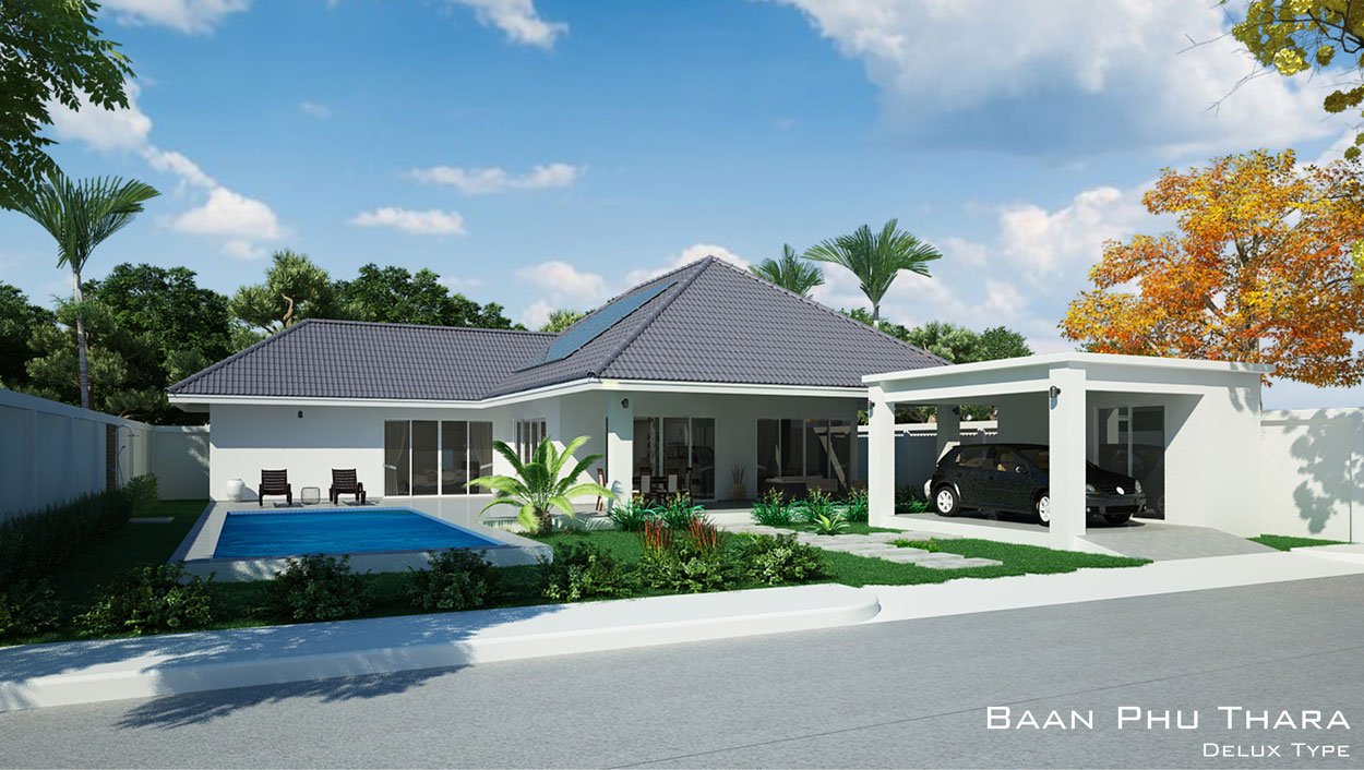 Deluxe Villa is a three bedroom design with all bedrooms having en-suite facilities, this villa has a living area of 183 Sqm. The master and first guest bedroom enjoys access to the terrace and a 10m x 4m swimming pool. The main area of the house, which includes the Kitchen, Dining and Living room, is open plan. From 10.975M THB