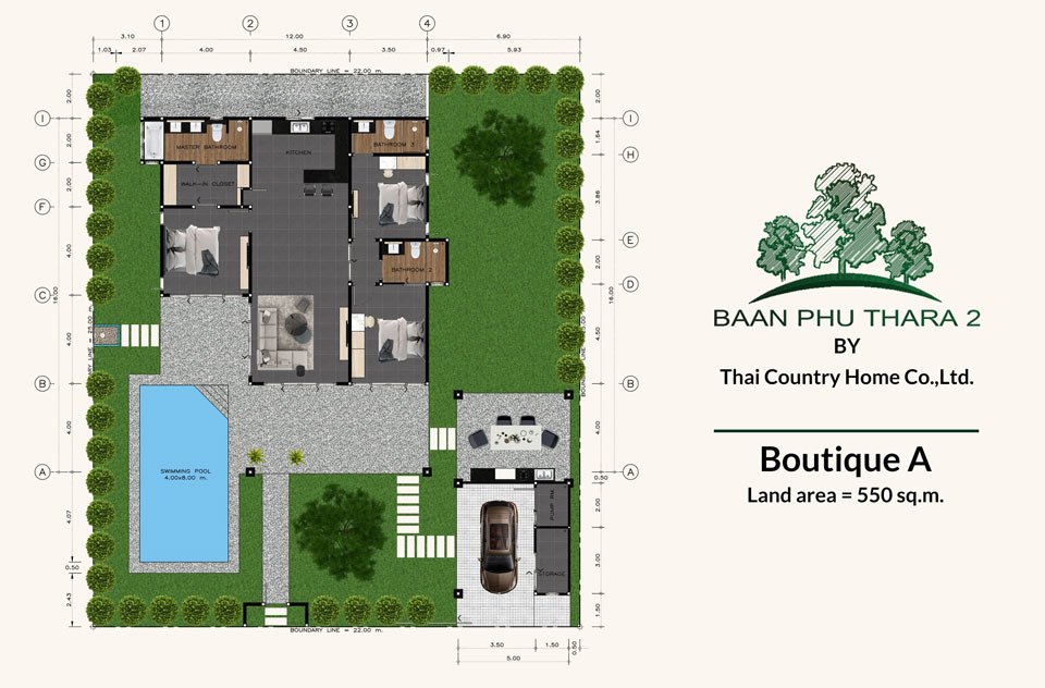 Boutique Villa is a three-bedroom design with all bedrooms having en-suite facilities, this villa has a living area of 163 Sqm. The master and first guest bedroom enjoys access to the terrace and 8m x 4m swimming pool. The main area of the house, which includes the Kitchen, Dining and Living room, is open plan. From 9.512M THB