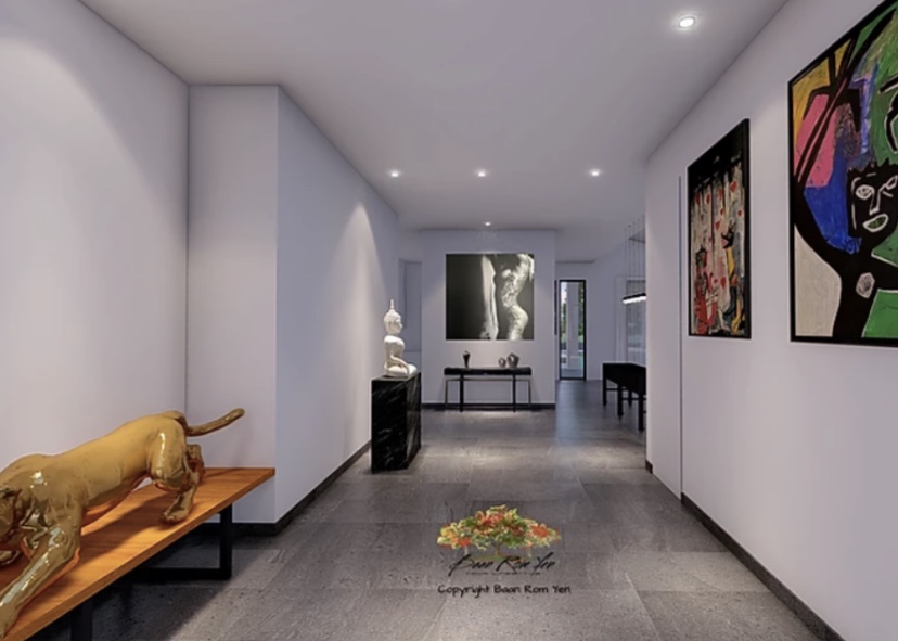 The owner of this Minimalistic Villa worked closely with the team of Baan Rom Yen in order to create the perfect living environment for him and his family.The property is characterised by its clean lines, a large water feature in front of the Villa and a large pool a the back of the Villa enclosing the Main Villa, Guest House & the Sala.