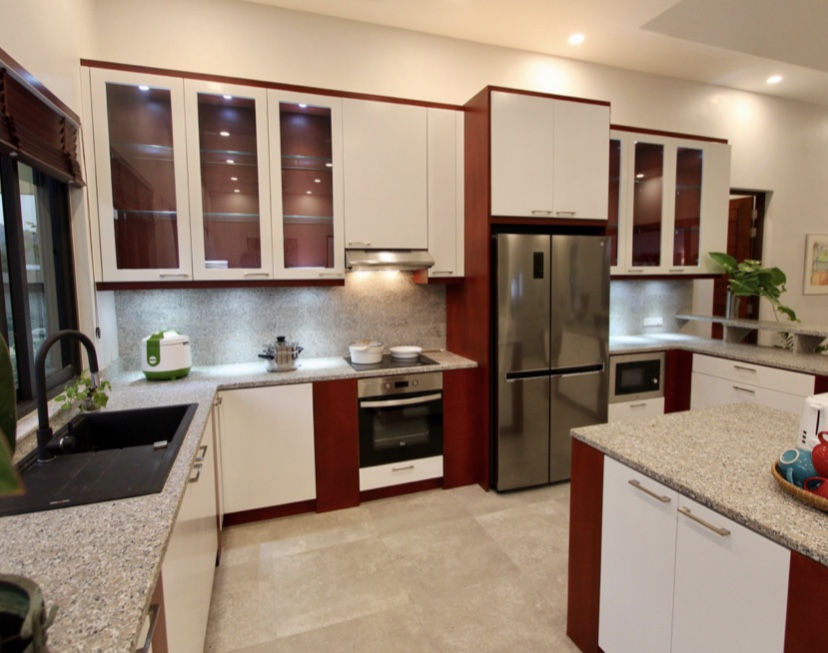 Price of a 4 bedroom, 3 bathroom pool villa at Golden Sands is 13.49 M THB (fully furnished). This includes a covered outdoor BBQ kitchen sala & granite bar, custom high-gloss interior western-style kitchen with granite counter tops, vaulted ceilings in the living room, AC units & ceiling fans in all bedrooms & living room, built-in wardrobes, covered carport for 2 cars, motorized & remote controlled entrance gate, basic gardens and a 12 x 3 m marble tiled swimming pool on a plot size of 972 sqm