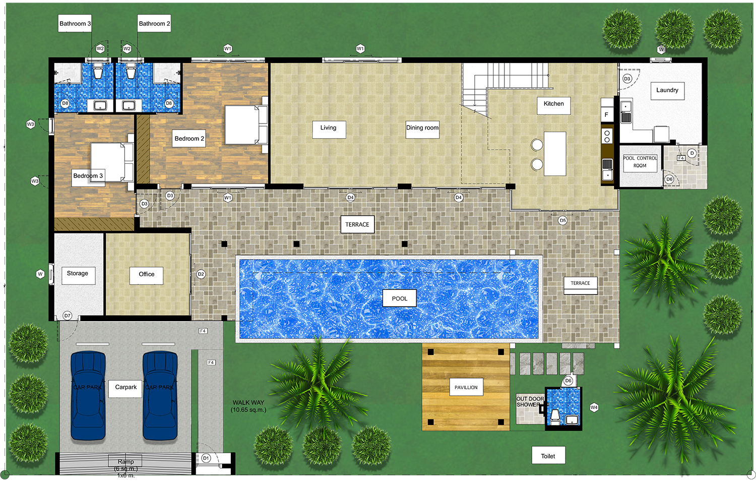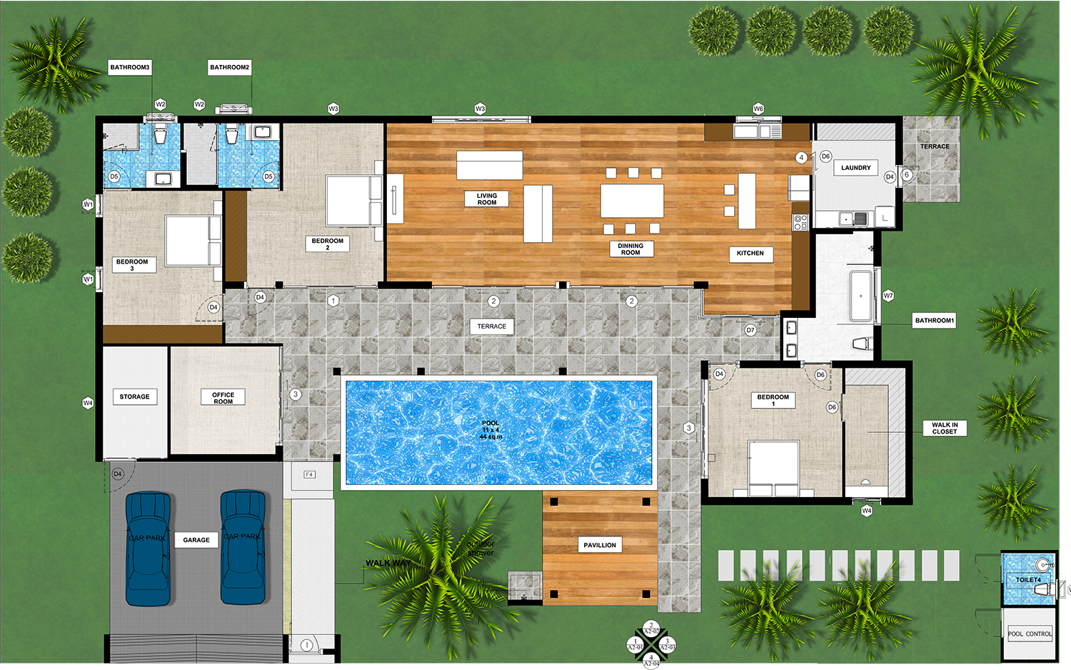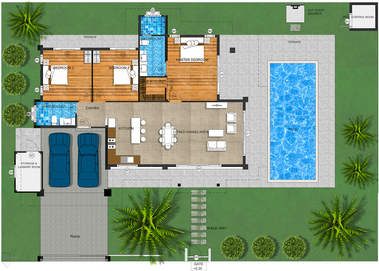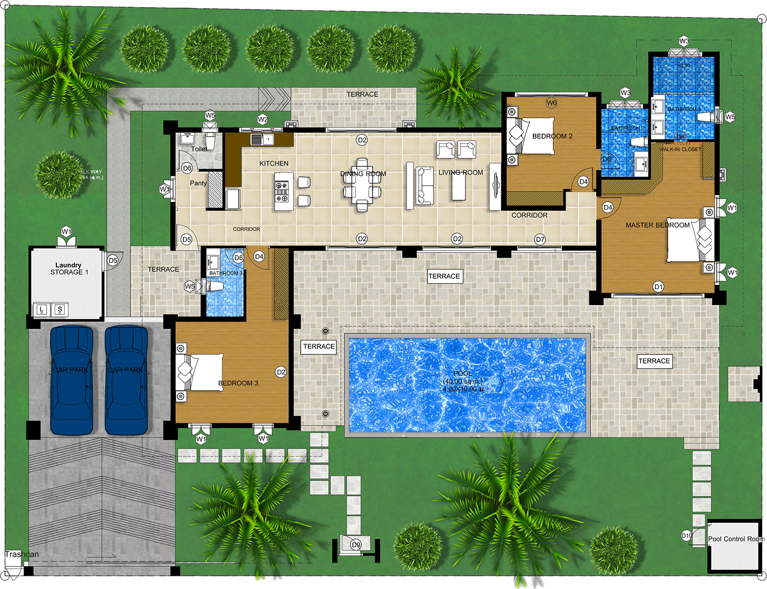 - Structure: 3 bedrooms, 3 en-suite bathrooms, office room, designer kitchen, 2 cars covered parking with automatic sliding stainless steel door, storage room, laundry room