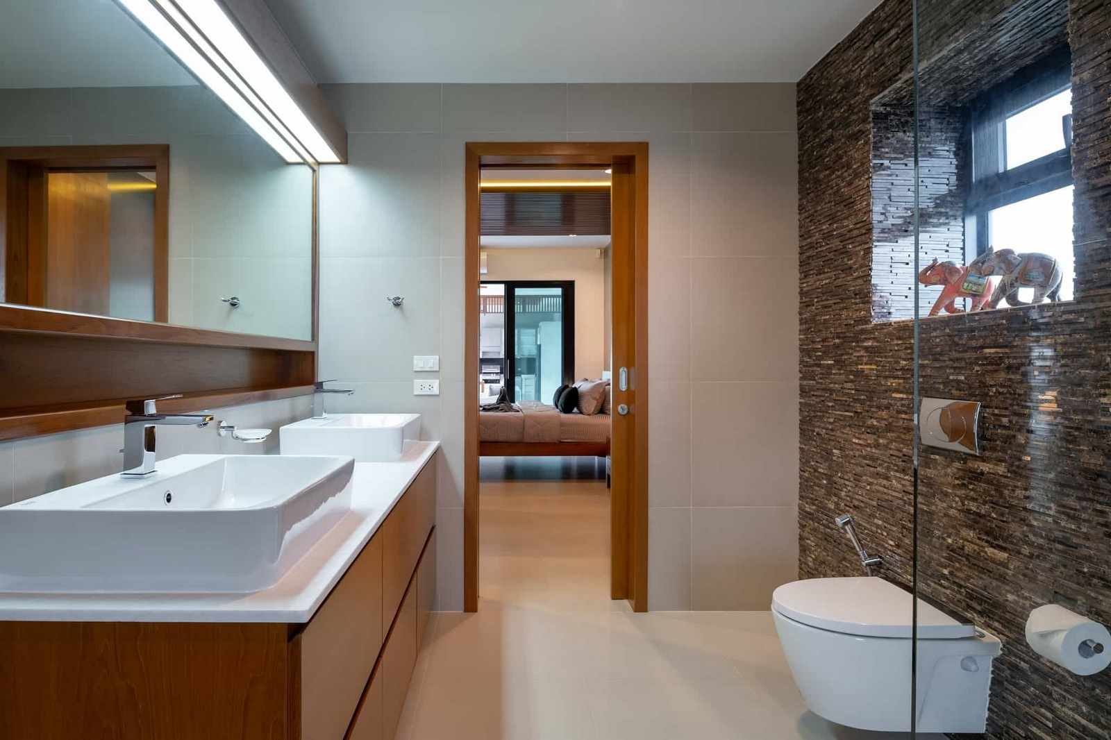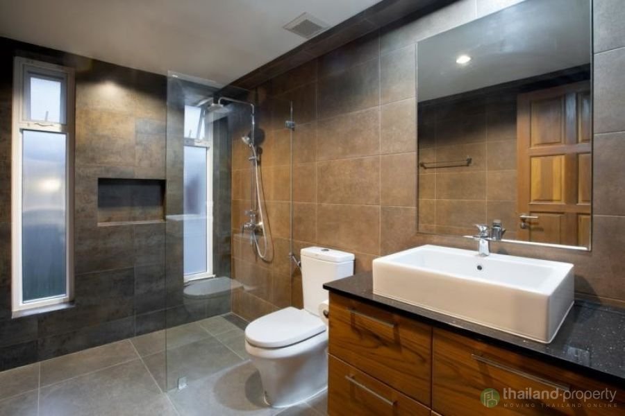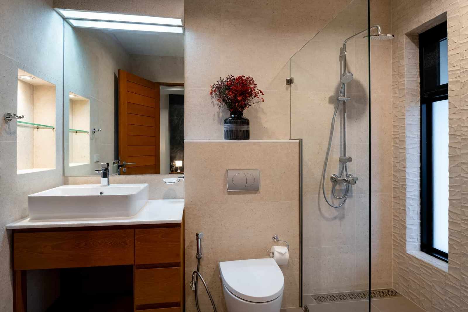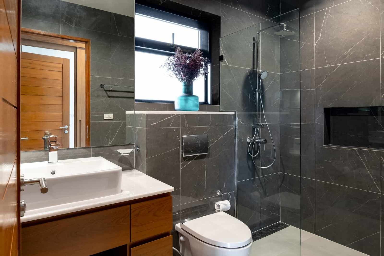 - Standard bathroom design installed consists of washbasin, granite-topped counter, wet/dry area partition with thick tempered safety glass and your choice of either rain shower or hand shower.