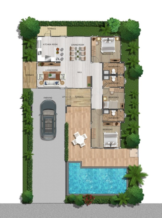 There are currently 4 Pool Villa designs offered by the developer ranging from 2 Bed / 3 Bath to 4 Bed / 5 Bath. Each design has an expertly constructed comprehensive, quality specification . The developer is also open to consider custom requirements in line with the overall style of the project.