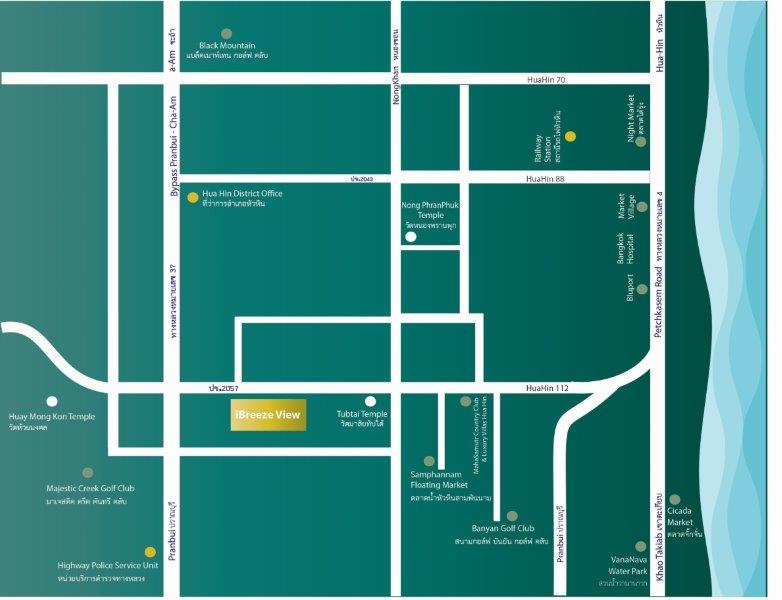 Next to i Breeze View, Soi 112 is a major 16 metre dual carriageway artery which has recently been resurfaced. There is easy 10 minute access to a host of restaurants, shopping malls, hospitals, schools, golf courses etc. in Hua Hin. Cha Am (N) and Pranburi (S) can both be reached within half an hour.