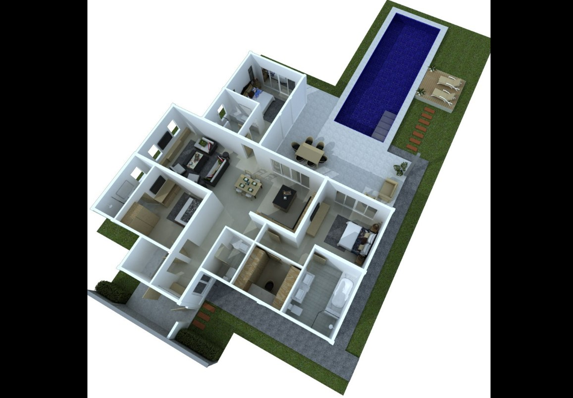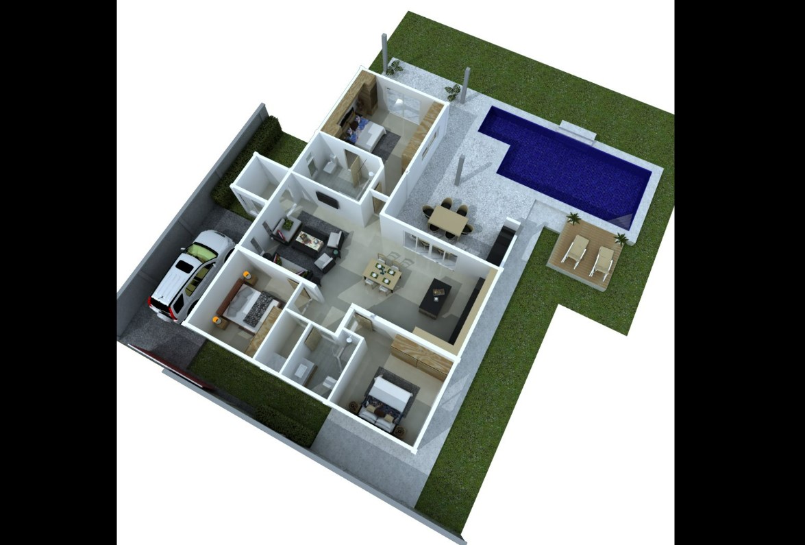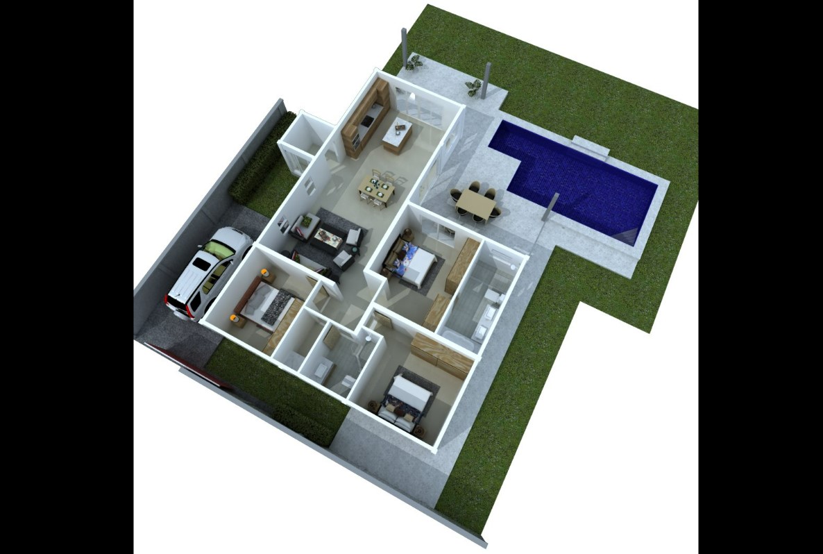 Offers a living area of 192 sqm, has 3 bedrooms and 2 bathrooms and comes with an island design kitchen as standard, vaulted ceilings in the main living space with ceiling mounted air conditioning. 2 covered terraces areas, including a built in BBQ kitchen, which are adjacent to the 9.5m x 4m swimming pool, which has a sundeck area.
