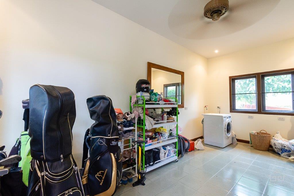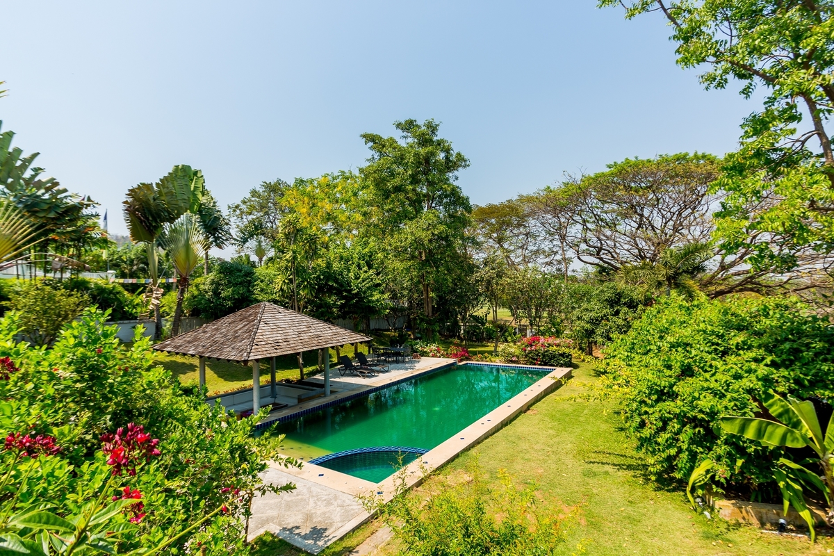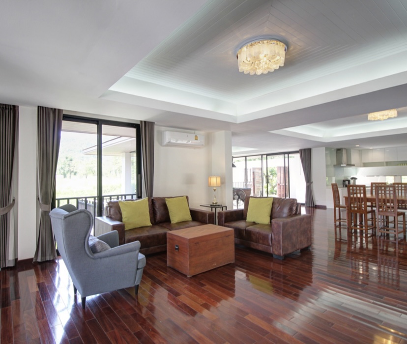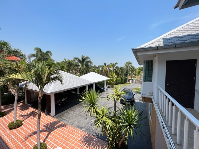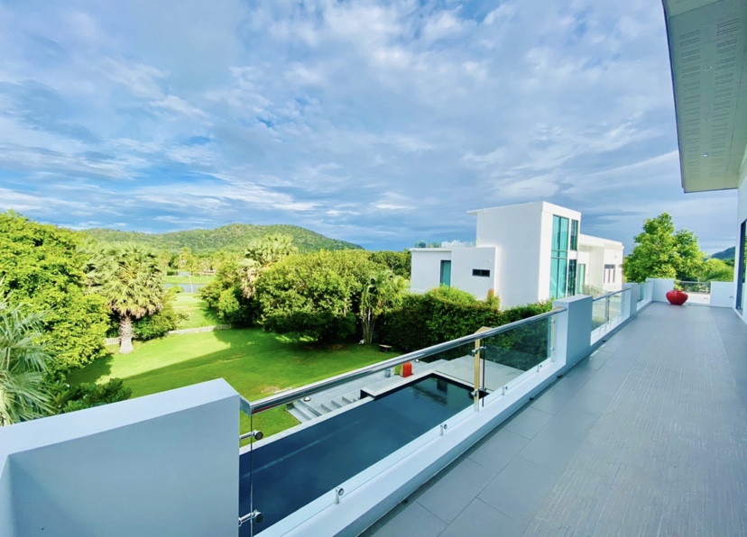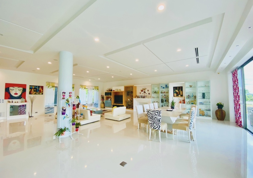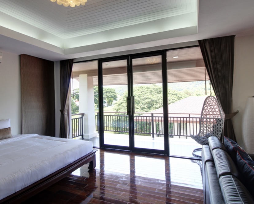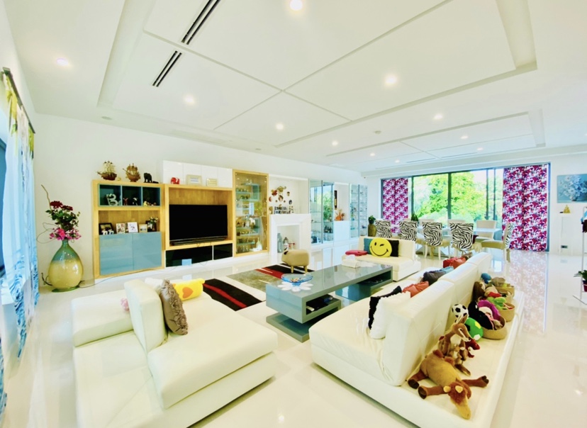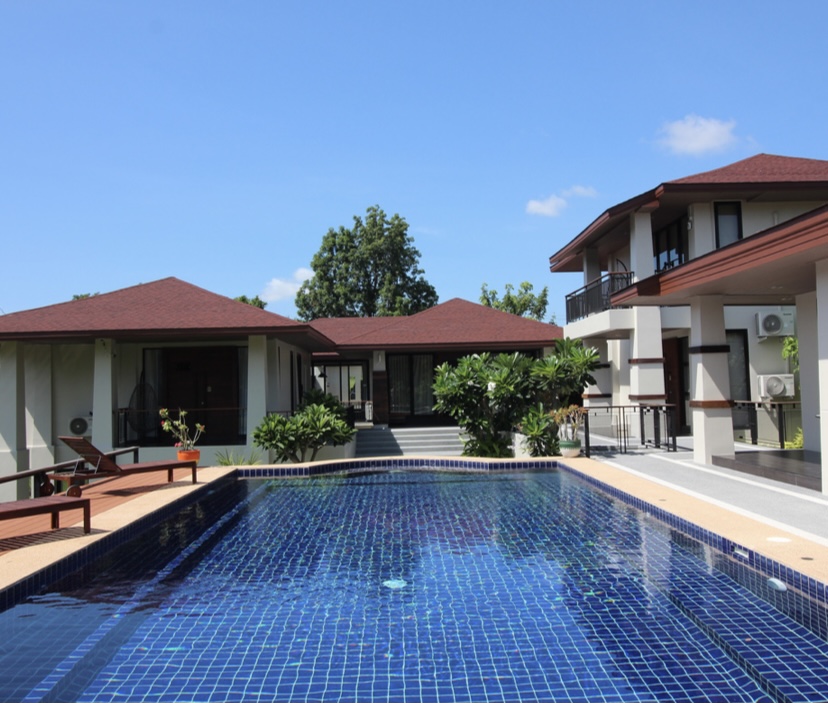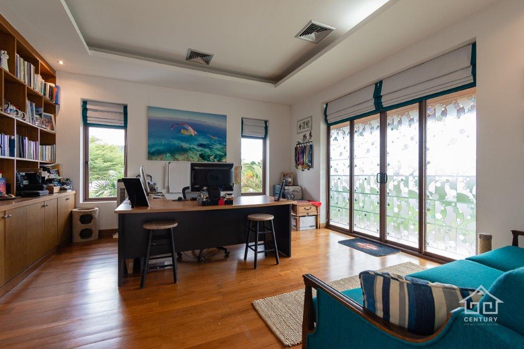 This villa consists of 3 bedrooms in the main house, a seperate 2 bed guesthouse with en-suite bathrooms and a second guest house that has a full kitchen, living room, bedroom and bathroom. There is a garden Sala for chilling where you can see golf hole 7 which is a par 5 and nice square shaped swimming pool. The main house consist of living room , kitchen and office room at the ground floor and the second floor have 3 bedrooms and 3 bathrooms with nice decoration throughout.