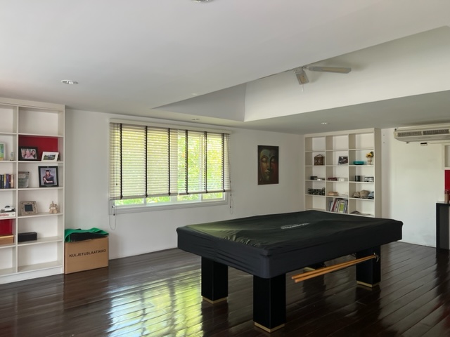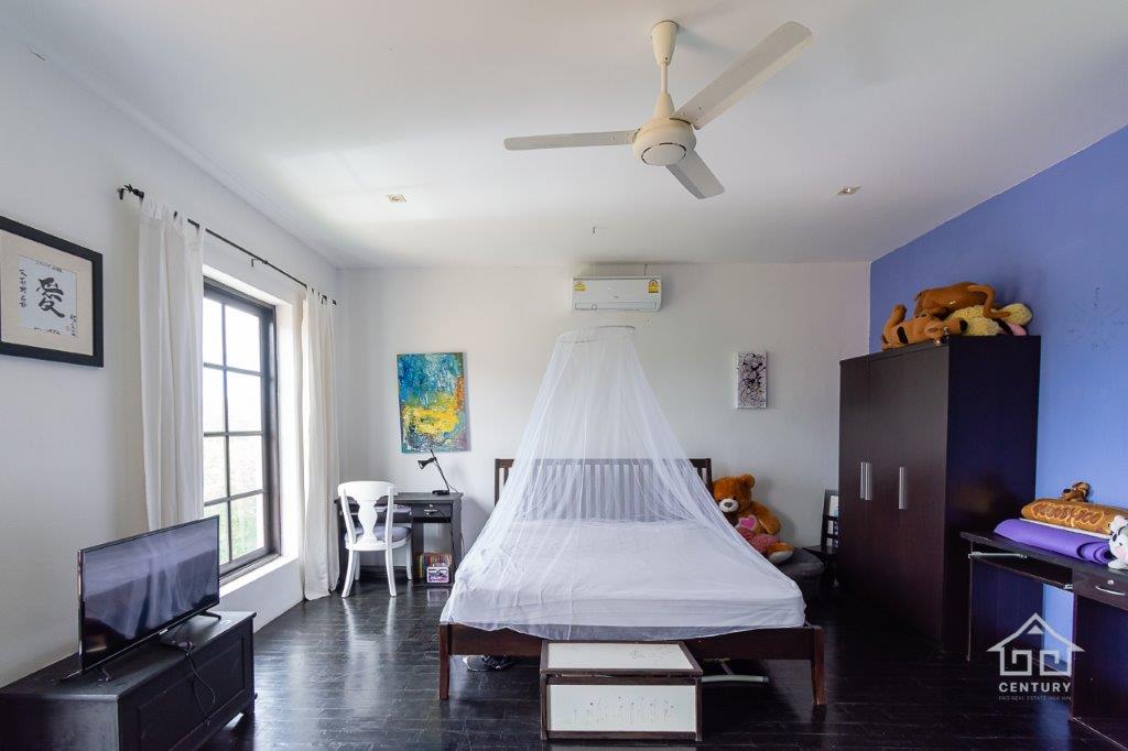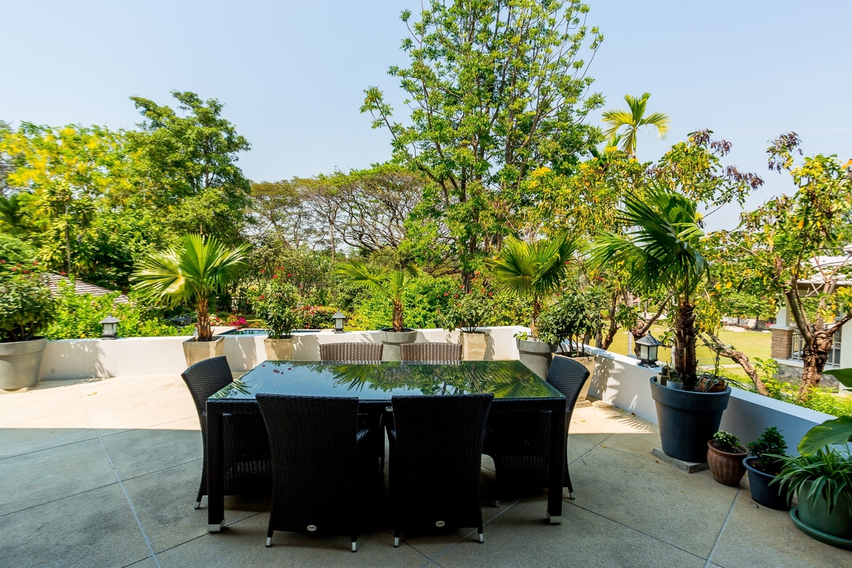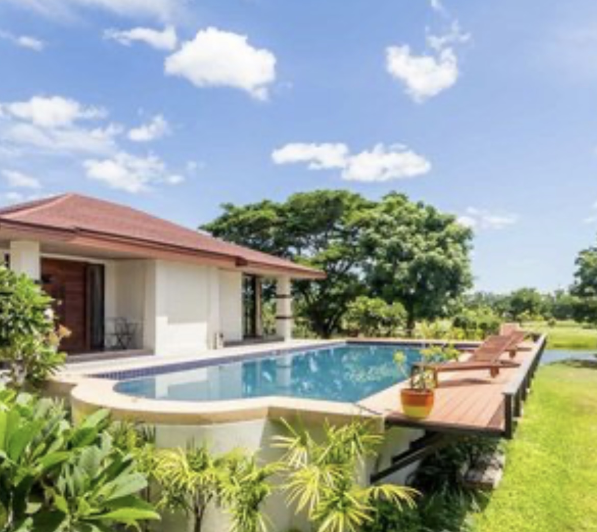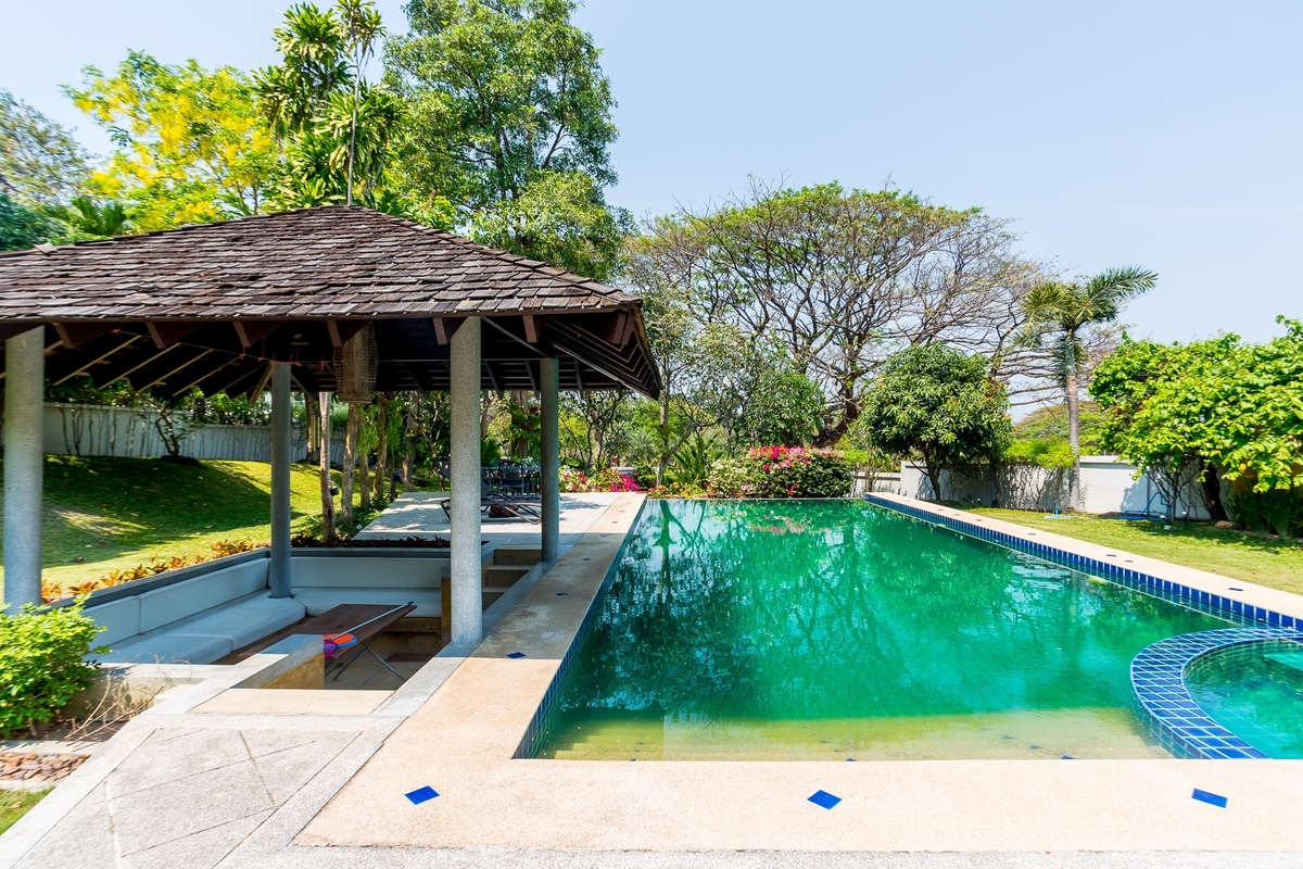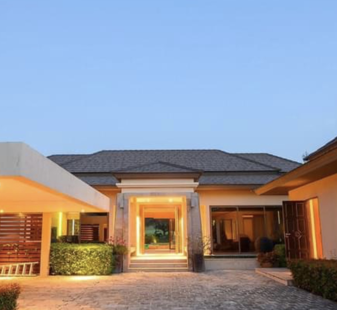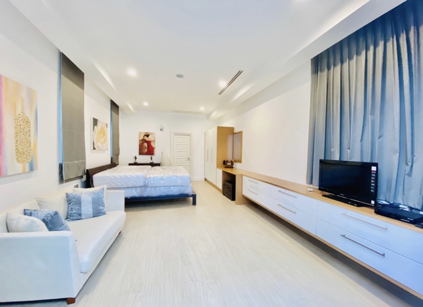 This villa consists of 3 bedrooms in the main house, a seperate 2 bed guesthouse with en-suite bathrooms and a second guest house that has a full kitchen, living room, bedroom and bathroom. There is a garden Sala for chilling where you can see golf hole 7 which is a par 5 and nice square shaped swimming pool. The main house consist of living room , kitchen and office room at the ground floor and the second floor have 3 bedrooms and 3 bathrooms with nice decoration throughout.