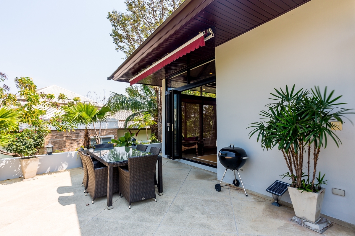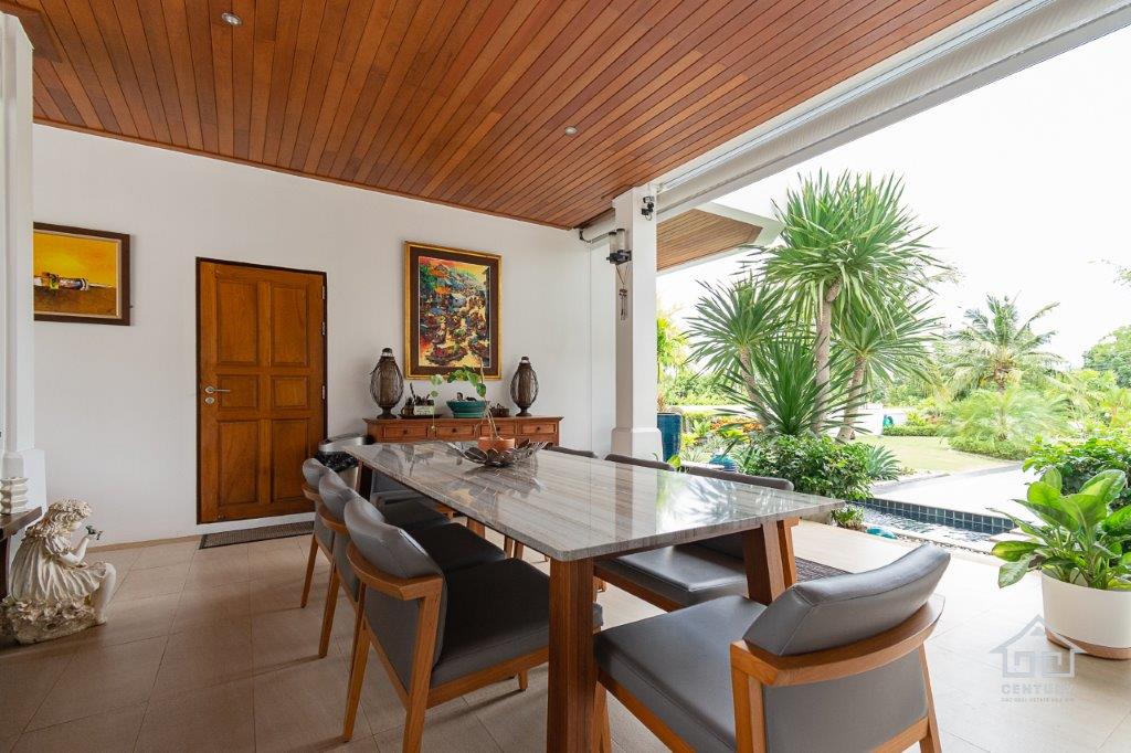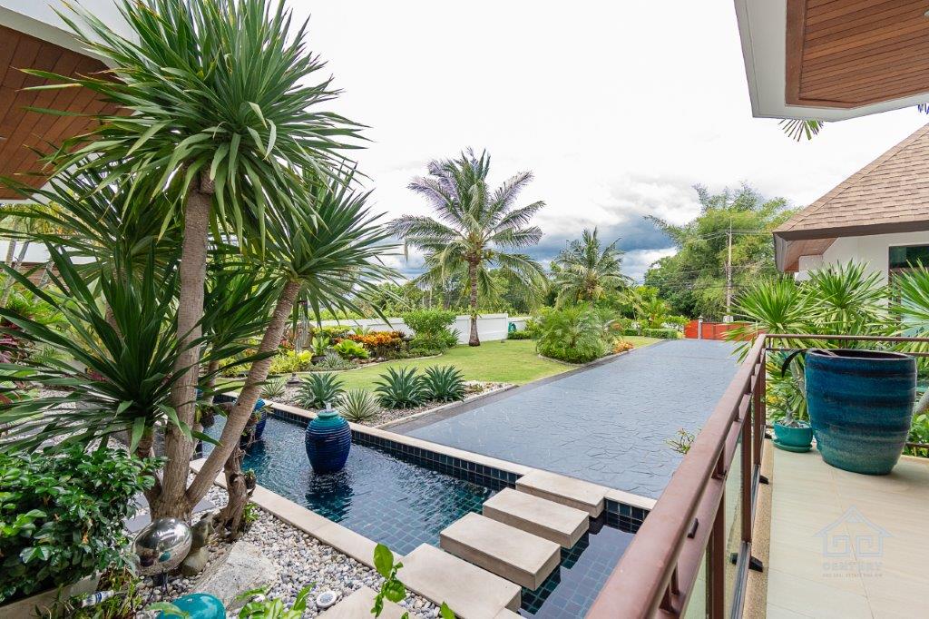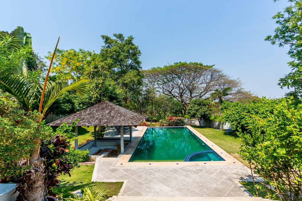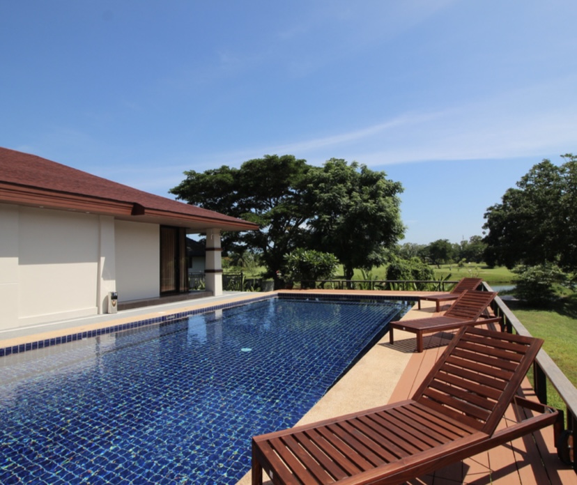 Well designed 2 storey pool villa in very private tropical grounds with great views of golf course and nearby lake. The owner is an architect who spent a lot of time making this villa perfect for a large family. The villa is divided into 2 buildings, the first having 2 double ensuite bedrooms on the second floor with maids quarters and attached double garage on the ground floor. The second building has a Master ensuite bedroom plus a large second room that can be a bedroom or as currently used, a large office with wide covered terrace. On the ground floor is a great kitchen, an open dining room and then a beautiful living area with sliding doors opening up to the pool and decking area. From the living room, the pool and the master bedroom are fantastic views of the golf course and the lake. The garden is very well planted giving a very private feel to the house. The Owner has the plot next door which he will then build a new home once this house is sold, the plans for this house are already produced so the buyer of this house can see what will be built next door.