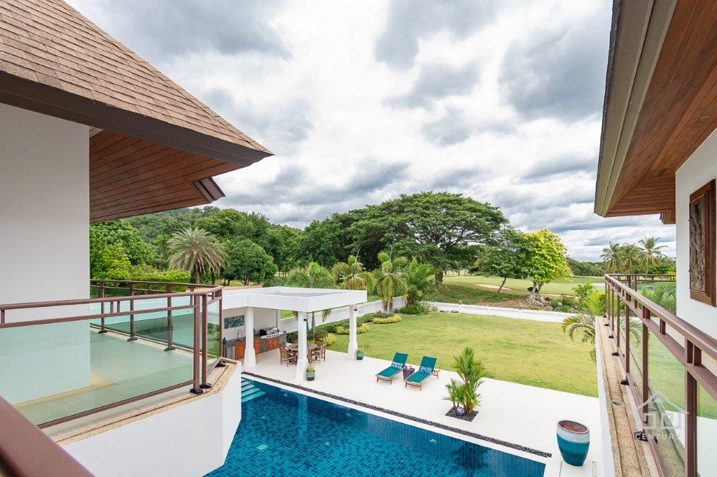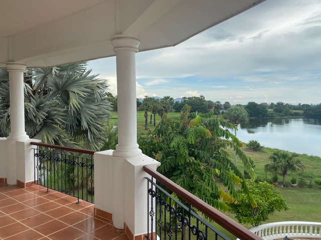 Luxury 6 bed pool villa on golf course with great golf and lake views. The impressive villa has been built to exacting standards throughout and offers spacious rooms. The design is to combine 3 different buildings, the first has maid quarters including kitchen the second has the spacious living, dining and kitchen area, the third has guest bedrooms on 2 floors with en-suite bathrooms and the fourth has the master bedroom with en-suite bathroom and living area. All the bedrooms have lovely covered balconies with views. The outside has a triple car port, tropical gardens and large pool.