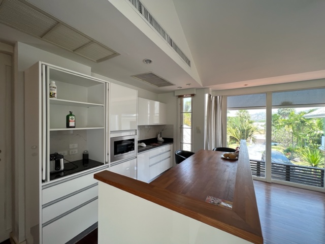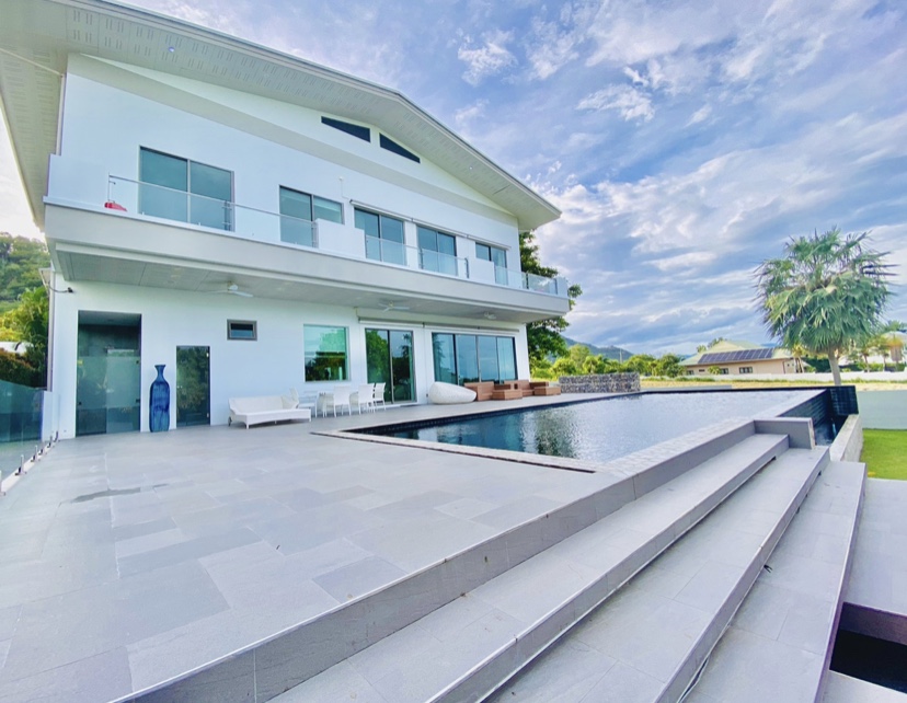 This pool villa was built by the team responsible for the stunning Baan Ing Phu project using the highest standard materials available. The villa is for the fastidious buyer looking for a great plot and beautiful home at Palm Hills. The main house features a stunning entrance with handmade copper front door, large TV area, a feature kitchen with island and dining area and a further kitchen which is where most food preparation and storage is done. There is a large storage area located off the main living room, which is the center point for all electrical/media services. The office room leads directly to the master suite which has a stunning bathroom and beautiful walk in robes.. The property has 3 beds in the main house and a separate guest house with en-suite bathroom which is located in the rear along with a separate maids quaters with utilty area where all washing and household chores can be done. The plot has lovely views of the mountains and the lake sits in front.