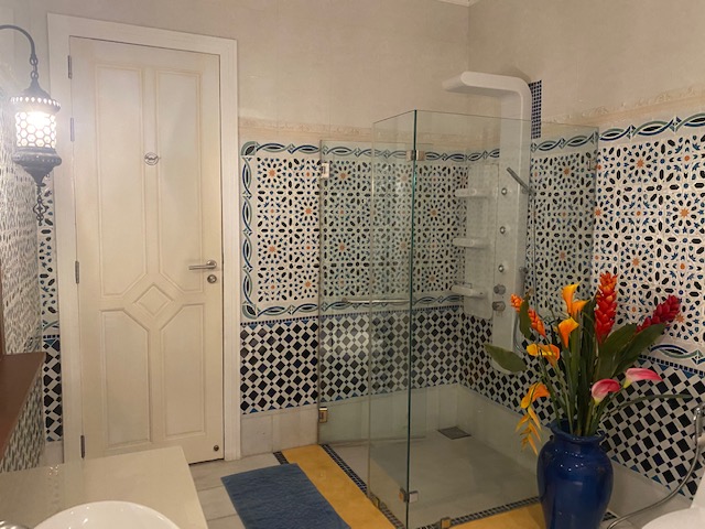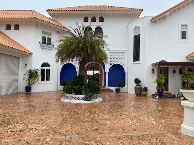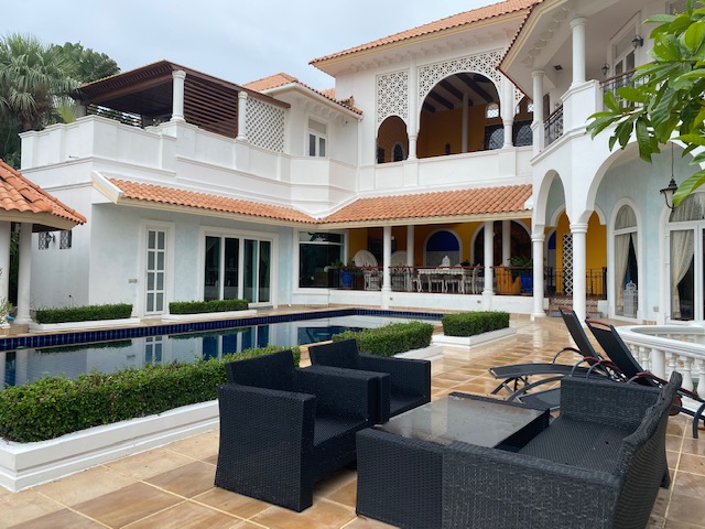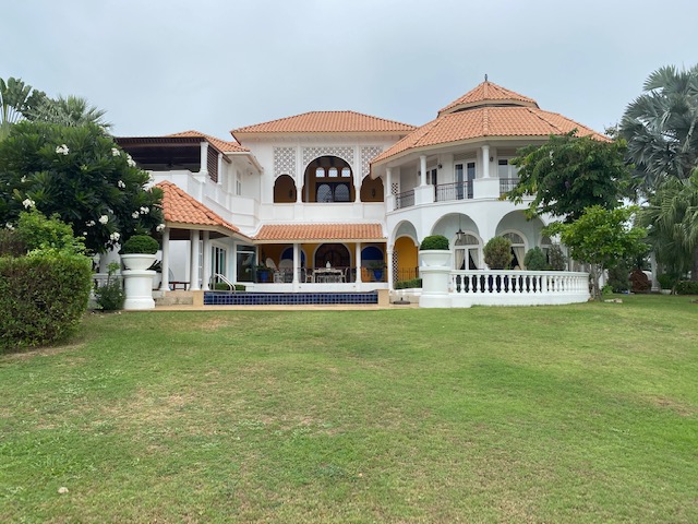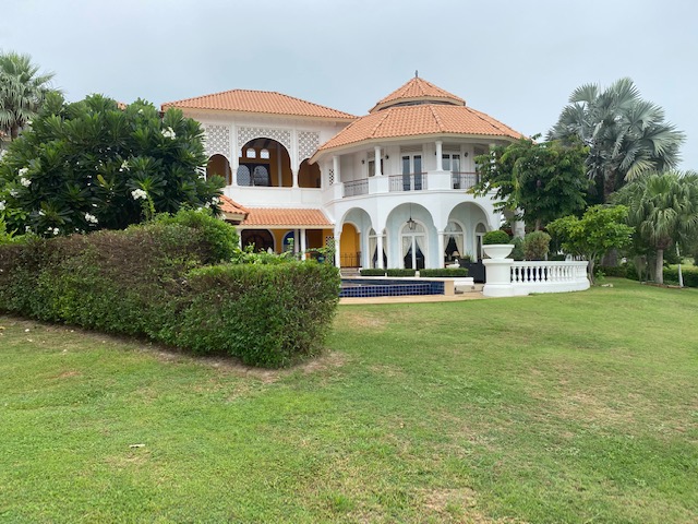 Outstanding 6 or 7 Bed Mansion on Palm Hills Golf Course over looking huge lake. This amazing Villa has been styled on a Moroccan theme and is high end luxury in construction and all the fixtures and furniture. The villa features on the ground floor a grand entrance that leads to the modern fully equipped European kitchen with addition Thai kitchen and utility room, dining area with triple aspect windows, very spacious living room with access directly to the garden and pool, guest bedroom 1 with en-suite bathroom, separate stairs from the main stairs up to 2nd guest bedroom with en-suite. There is also a further bedroom and TV lounge. Via the main stairway you go up to the second floor impressive landing to a beautiful drawing room with access to the second floor covered terraces, a large bedroom currently being used as office, 5th guest bedroom with en-suite bathroom, Master Bedroom suite with walk-in wardrobes, huge bathroom and access to private terrace and Jacuzzi over looking the lake. Outside is a large pool, covered terraces and patios, manicured landscaping all round the property, garage and parking, feature driveway and entrance with stamp concrete and beautiful detailed entrance gates,