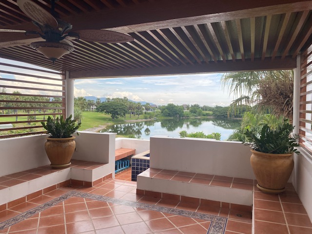 Great design 5 bed pool villa with great views over a lake and fairway of the golf course. The Villa features a design that gives a ground floor and second floor covered terraces for entertaining. The ground floor features a living room, dining room, separate kitchen, 2 bedrooms with en-suite bathrooms, a maid quarters and garage with plenty of storage areas and upstairs has 2 bedrooms with en-suite bathrooms and a large office room which could also be a bedroom. The upstairs has the great views from several covered terraces. The gardens are well planted with a large pool and sundeck area. At the front is a long driveway accessed by an electric gate.