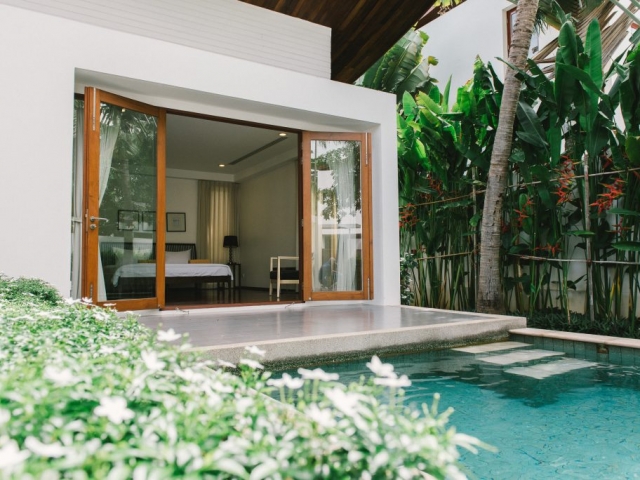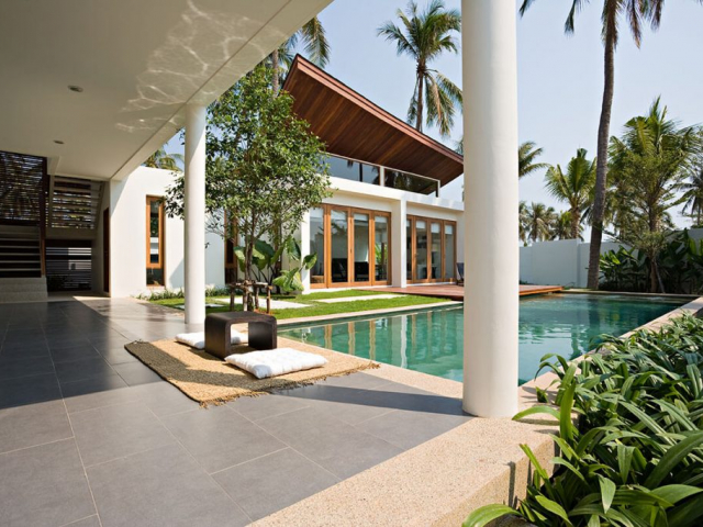 PRAN A LUXE Private Residences offer a selection of six different styles for your contemporary pool villa, ranging from two to four bedrooms. A usable living space of 175 to 680 sq.m. is wrapped in a unique tropical architectural style. The creative “sea wave” design for the roof presents a unique silhouette with a double-curved floating structure in solid hardwood. Let the natural light stream into the interior space, while large sliding doors invite the nature in. each villa enjoys its own private swimming pool with multiple decking surrounded by a tropical garden, adding the option for yet more water features.