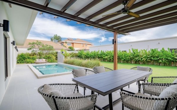 Great Design 3 bed pool villa. This villa features a spacious open plan living, dining and Modern European kitchen, 3 bedrooms and 3 bathrooms and outside is a spacious covered terrace beside the pool and garden which is laid to lawn and plants and there is a double carport and electric entry gates. The villa is high quality and well furnished