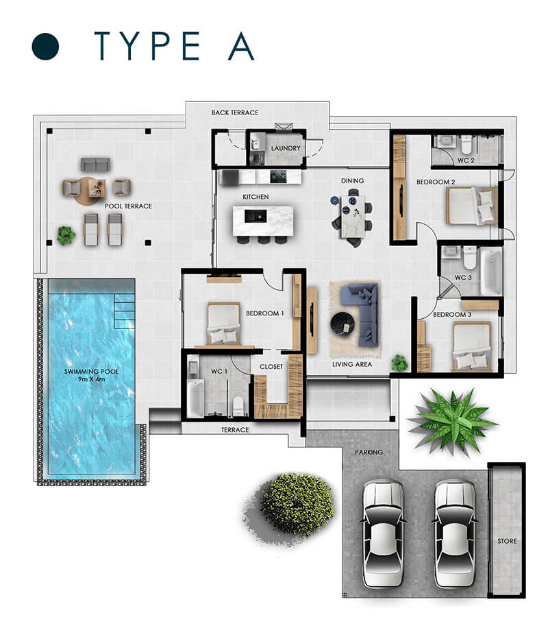 TYPE A 3 Bed / 3 Bath LAND from 578sqm TOTAL HOUSE 318.40sqm From 14.1MTHB