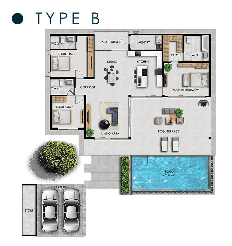 TYPE B 3 Bed / 3 Bath LAND from 600sqm TOTAL HOUSE 332.85sqm From 14.8MTHB