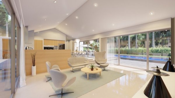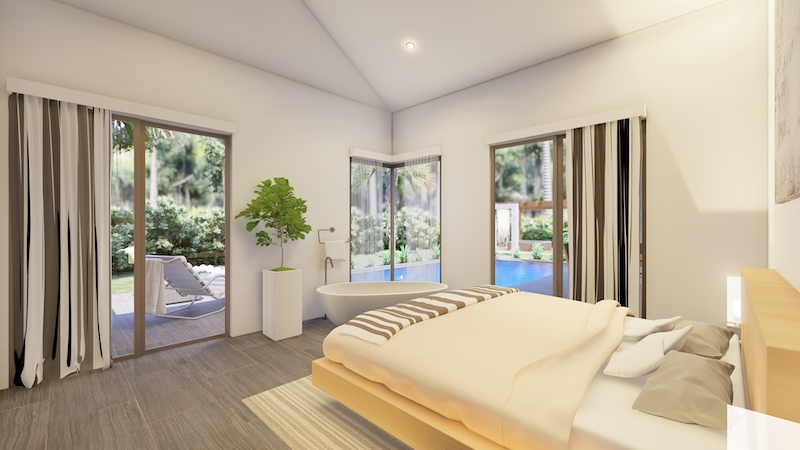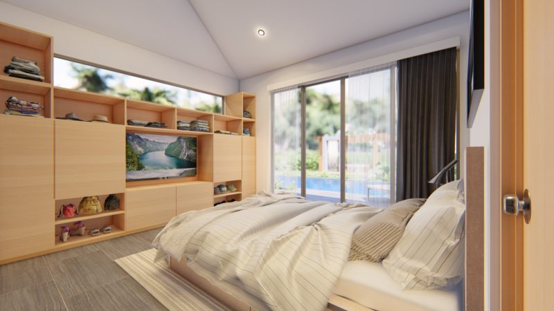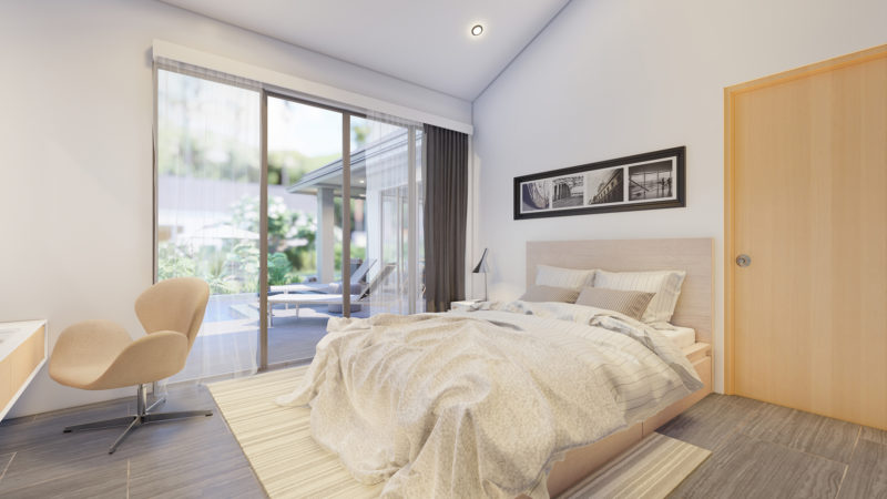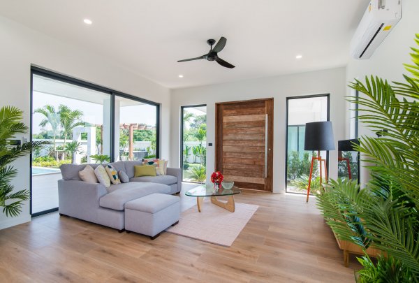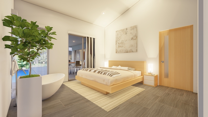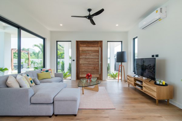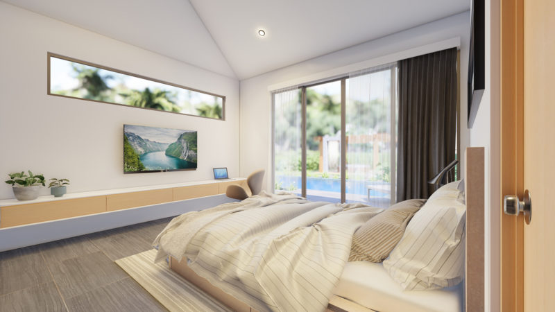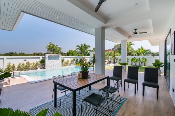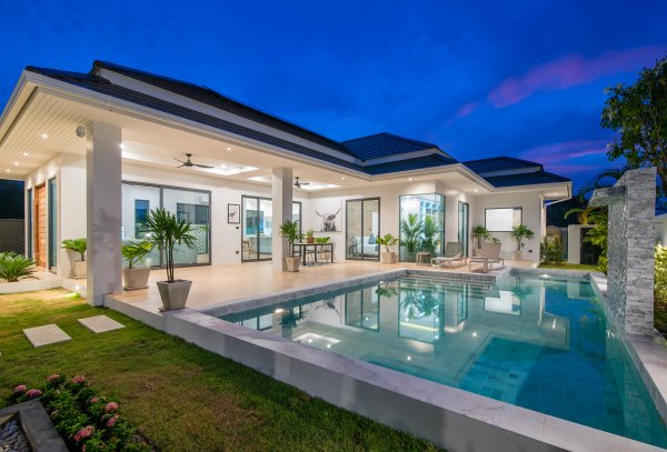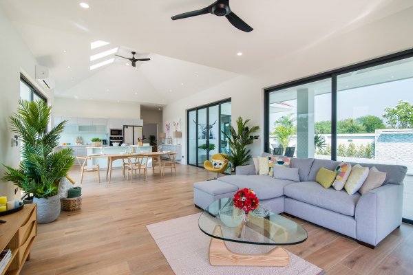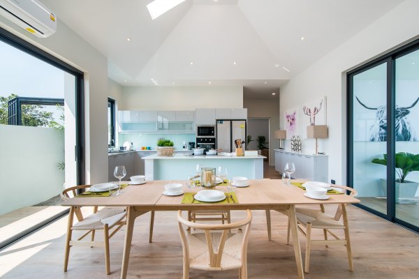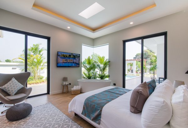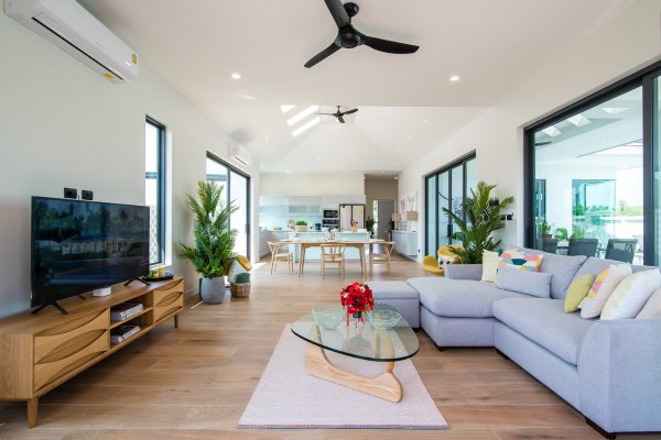 At the centre of the prime villas hua hin Thailand, you find the designer kitchen & dining area with high ceilings & a generous living area with lots of room & pace. This entire living area is bright & airy, with large sliding glass doors opening into the pool terrace with room for alfresco dinning with a cool breeze under the ceiling fans. Buy villa hua hin as it is designed with modern elegance & low maintenance making Villa Teak a great choice for living.