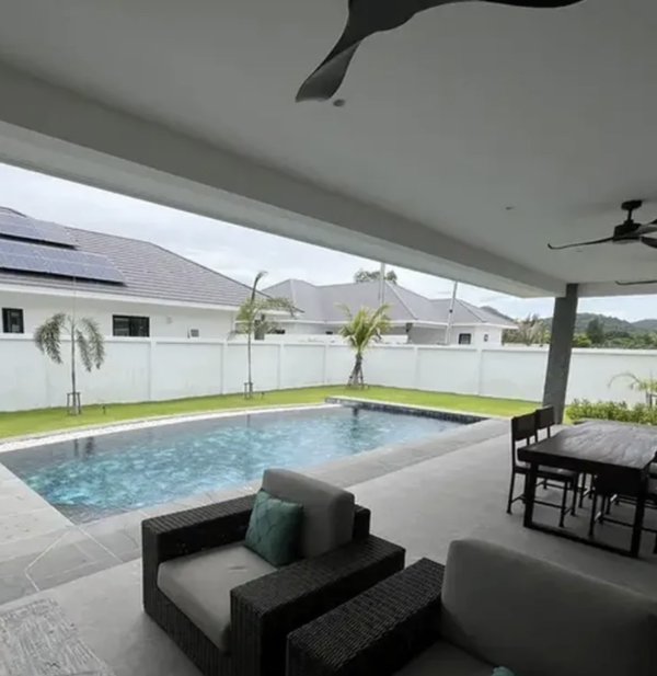 Beautiful spacious L shape pool villa with very spacious open plan living, dining and modern European kitchen, 3 bed and 3 bathrooms and poutside large 12 x 4 pool and large covered terrace. Outside BBQ optional